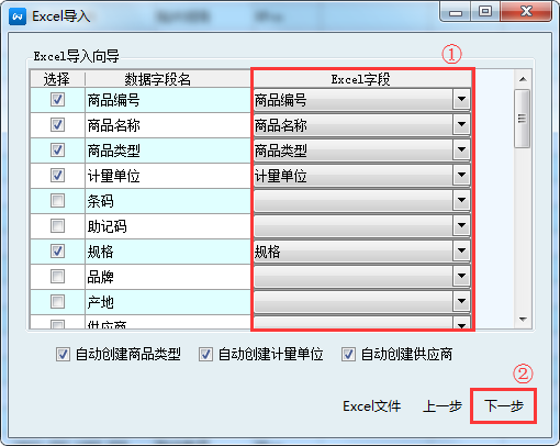 2.2導入前確認好左右字段,Excel對應字段需要手選,點下一步按提示操作即可。