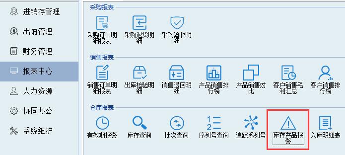 庫存產品會在超出范圍時提示報警,報表中心----庫存產品報警