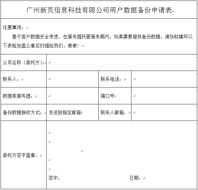 數(shù)據(jù)安全在我公司一直都非常重視,為了避免離職員工找我們索要數(shù)據(jù),出現(xiàn)數(shù)據(jù)外泄;基于數(shù)據(jù)安全考慮,即日起,如果云托管的用戶,需要向我們索要備份數(shù)據(jù),需填寫以下表格加蓋公章,掃描給客服。由此給您帶來的不便,我們深表歉意!